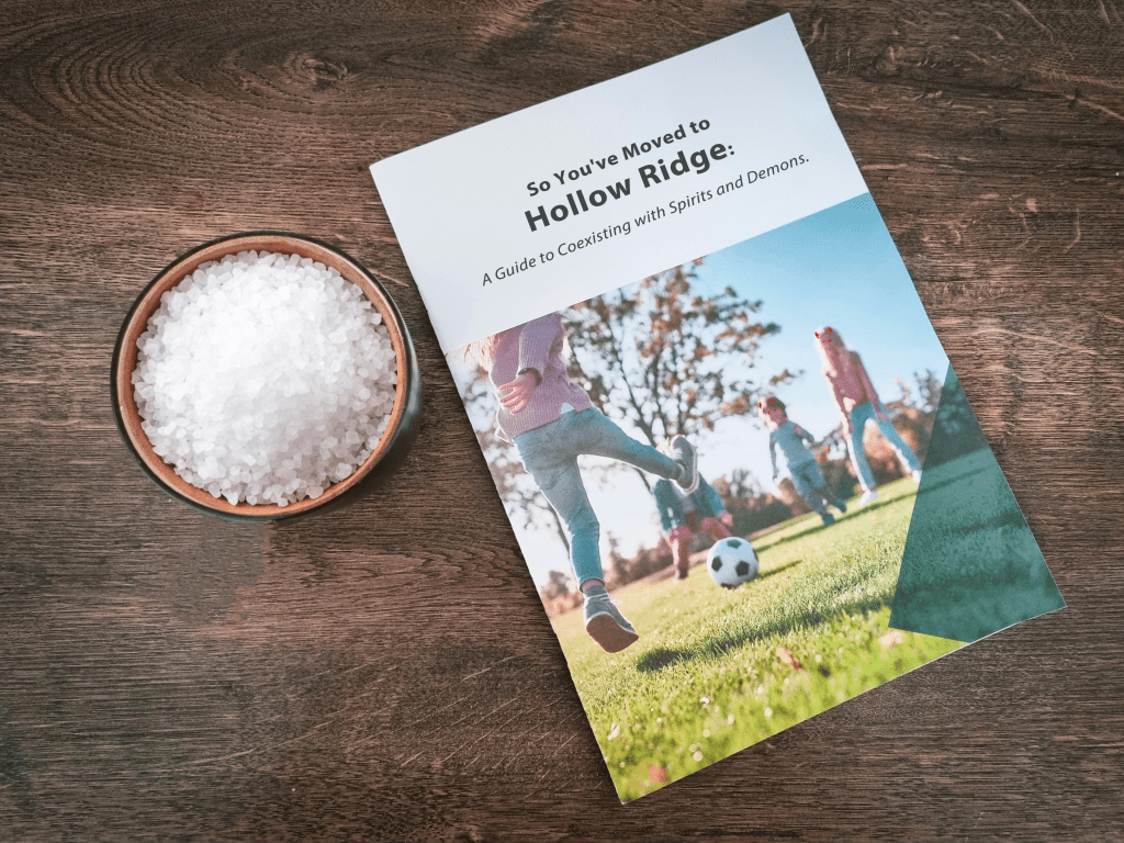 He left me with a bottle of consecrated salt and a pamphlet titled “So You’ve Moved to Hollow Ridge: A Guide to Coexisting with Spirits and Demons.” Yep, definitely adding that to my bedtime reading list.