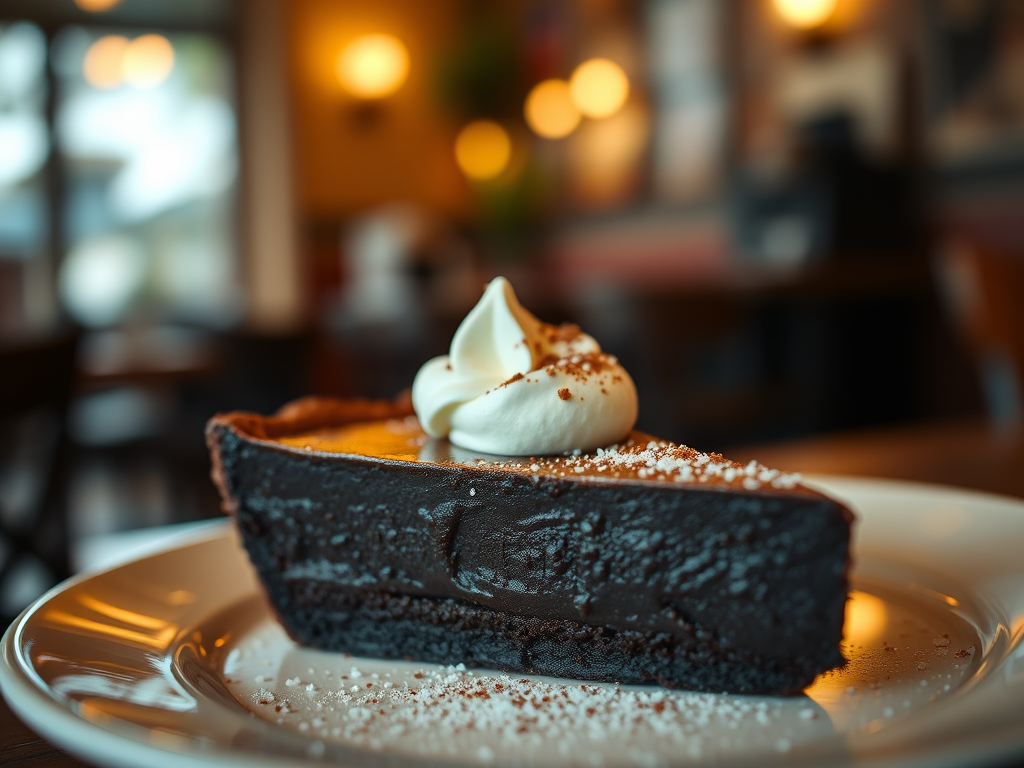 After a few minutes, the barista returned with a slice of chocolate fudge pie. It was so rich that it seemed to absorb the light around it. She placed it on the table before me with a single fork. The pie was dark, almost impossibly so, with a glossy finish that looked like it might pull you in if you stared too long. A dollop of whipped cream sat at its side, dusted with cocoa powder and just a hint of sea salt.